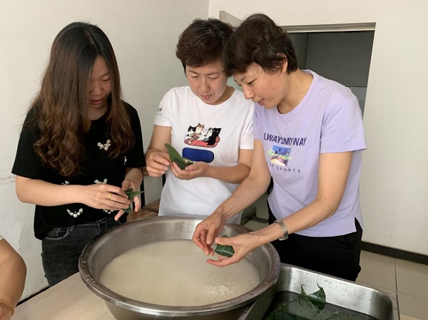 上午9點(diǎn),粽葉、糯米、大棗整齊地?cái)[上桌。大家邊包邊聊,其樂(lè)融融。在包粽子現(xiàn)場(chǎng),熟悉包粽子的能手們飛快地拿起粽葉,兩手一窩卷成漏斗狀,填米、加棗、壓緊、扎繩,一氣呵成。她們還充當(dāng)起“老師”的角色,教“新手”職工包粽子,手把手現(xiàn)場(chǎng)教學(xué),“老師”教得仔細(xì),“學(xué)生”學(xué)得認(rèn)真,但要做出餡料十足、外觀漂亮的粽子還是需要費(fèi)一番功夫的。隨著技巧的不斷嫻熟,一個(gè)多小時(shí)的時(shí)間,形狀各異、大小不一的一百多個(gè)粽子就堆積成山了,預(yù)算科副科長(zhǎng)竇夢(mèng)娜說(shuō):“我們包粽子的水平真是越來(lái)越高了,明年再包會(huì)更好!”此時(shí)每個(gè)人心里都洋溢著一股喜悅之情,有初學(xué)一門(mén)手藝的欣喜,有參與集體活動(dòng)交流感情的滿足。