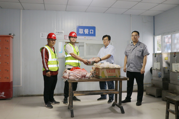 之后,劉志剛帶著月餅、豬肉等慰問品到作業(yè)班組生活區(qū)對(duì)一線工人進(jìn)行慰問,在食堂劉志剛把豬肉遞到班組長(zhǎng)手里并囑咐他們一定要提高節(jié)日期間的伙食水平,讓堅(jiān)持在現(xiàn)場(chǎng)施工的工人吃好,消除他們的后顧之憂。