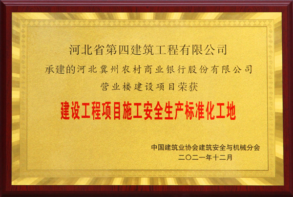 2021年12月22日,公司收到中國(guó)建筑業(yè)協(xié)會(huì)安全與機(jī)械分會(huì)下發(fā)的文件,我公司施工的河北冀州農(nóng)村商業(yè)銀行股份有限公司營(yíng)業(yè)樓建設(shè)項(xiàng)目喜獲全國(guó)安全生產(chǎn)標(biāo)準(zhǔn)化工地,這是公司第9次獲得此項(xiàng)榮譽(yù)。