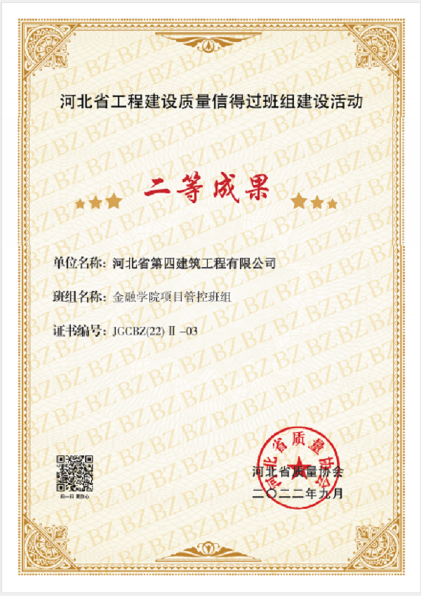 9月16日,六分公司收到了河北省質量協(xié)會頒發(fā)的證書,河北金融學院項目管控班組榮獲“河北省工程建設質量信得過班組建設活動”二等成果,并被推薦到中國建筑業(yè)協(xié)會交流。