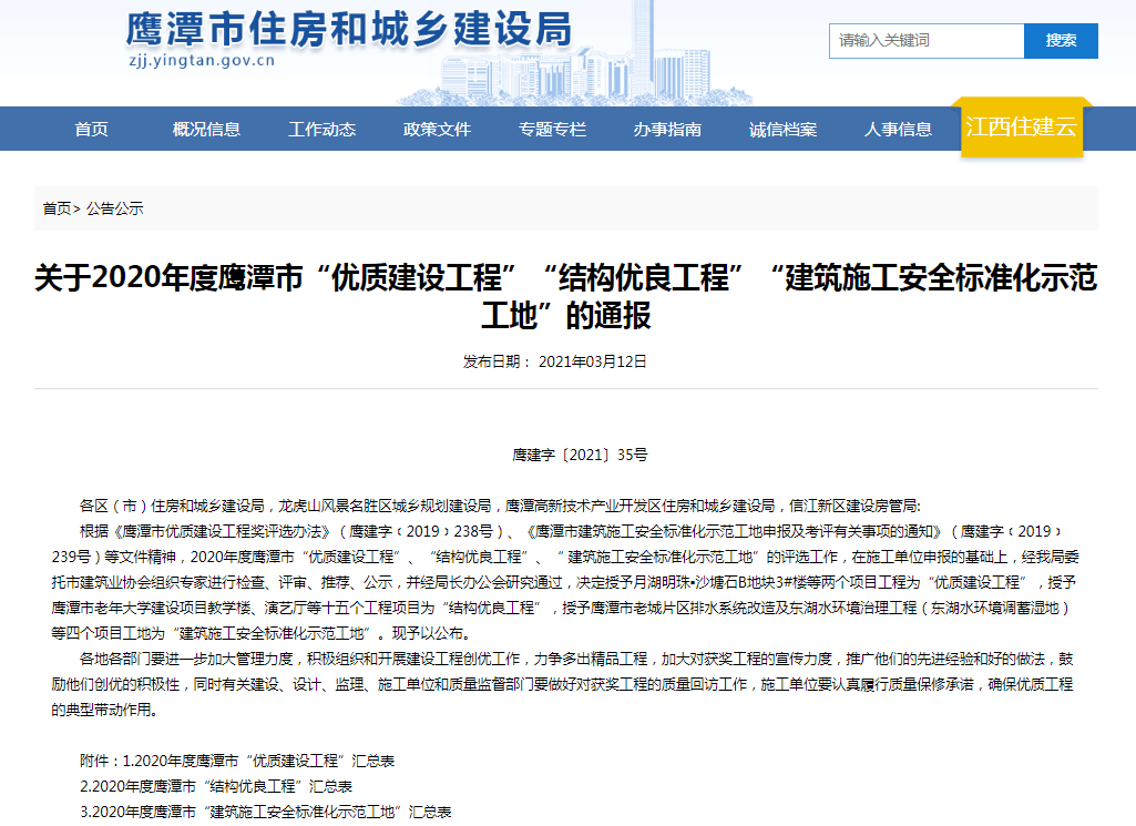 4月12日,從江西省鷹潭市住房和城鄉(xiāng)建設(shè)局網(wǎng)站獲悉,四分公司承建的鷹潭市檔案中心項(xiàng)目喜獲2020年度鷹潭市結(jié)構(gòu)優(yōu)良工程和建筑施工安全標(biāo)準(zhǔn)化示范工地兩項(xiàng)榮譽(yù)。