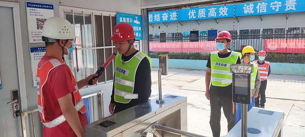 “師傅,對著酒精測試儀先吹一下”,5月16日下午2時,八分公司泰安王府花園項目在實名制通道對施工工人進行上崗前酒精檢測。