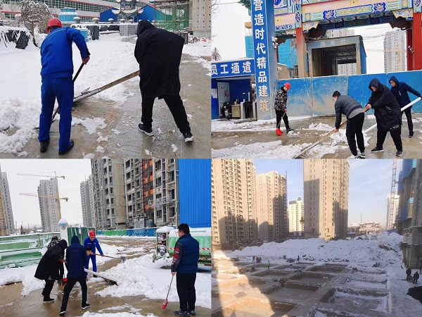由于本輪低溫降雪持續(xù)時間較長,整個施工現(xiàn)場積雪不僅厚還很瓷實,清掃工作十分困難。寒風凜冽刺骨,但大家熱情高漲,充分發(fā)揚不怕苦、不怕累的精神,黨員干部帶頭,職工群眾踴躍參加,按照分工好的清掃區(qū)域全面鋪開進行。設備管理員系上安全帶爬上塔吊,清理積雪,先后對各類機械設備進行維修保養(yǎng),檢查是否存在安全隱患;電工按照巡檢路線展開防寒防凍措施檢查,并對臨電周邊積雪進行清理;其他管理人員掃的掃、鏟的鏟、相互配合,清除辦公區(qū)及生活區(qū)積雪;在施工區(qū)域,各分包隊伍清理道路積雪,對1#、2#、6#、10#住宅樓各層采取冬季保暖措施,并對門窗逐個進行封閉;項目經(jīng)理帶隊,加強現(xiàn)場巡護,落實落細各項安全措施,確保雪后順利復工。經(jīng)過大家一個上午的通力合作,高質(zhì)高效地完成了掃雪除冰工作,確保重點區(qū)域沒有積雪結(jié)冰,切實保障了項目有序運行。