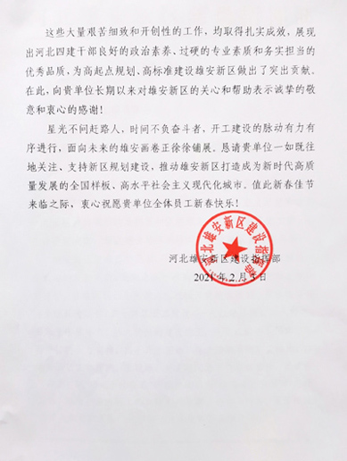 2021年2月下旬,公司收到雄安新區(qū)建設(shè)指揮部感謝信,信中就公司對(duì)雄安新區(qū)建設(shè)的支持幫助表示感謝,對(duì)選派到雄安新區(qū)工作的王現(xiàn)峰、孫文超同志給予高度肯定。