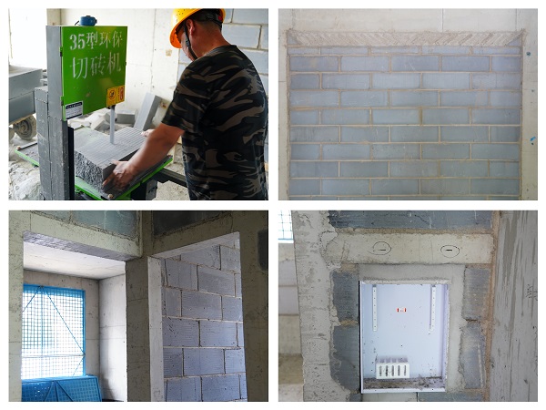 在材料利用與成本控制方面,項(xiàng)目團(tuán)隊(duì)探索出了“更優(yōu)解”。針對(duì)頂部斜砌施工,項(xiàng)目部原計(jì)劃采購(gòu)混凝土預(yù)制塊進(jìn)行砌筑,但在論證中發(fā)現(xiàn)采購(gòu)的預(yù)制塊存在成本高、運(yùn)輸損耗大、工序銜接慢等弊端。經(jīng)過反復(fù)研討,項(xiàng)目團(tuán)隊(duì)決定就地取材,利用現(xiàn)場(chǎng)加氣混凝土砌塊施工剩余的裁切廢料,通過定型化切割模具進(jìn)行精準(zhǔn)切割,替代外購(gòu)預(yù)制塊。為保障方案順利實(shí)施,項(xiàng)目部提前抽調(diào)技術(shù)嫻熟的切割工,組織加氣塊切割專項(xiàng)培訓(xùn),同時(shí)提前安裝調(diào)試好40余臺(tái)高精度切割設(shè)備,現(xiàn)場(chǎng)切割作業(yè)得以高效展開。這一創(chuàng)新方法的運(yùn)用,將加氣塊材料的現(xiàn)場(chǎng)利用率提高到90%以上,其切割面更加平整,有效保障了斜砌質(zhì)量和結(jié)構(gòu)整體性,提升了觀感效果。