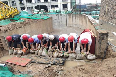 防汛演練緊貼實際。首先項目部按照預定方案和針對現(xiàn)場地形,最容易產(chǎn)生積水的車庫成為了此次防汛的重點搶險位置。在演練過程中于立功以身作則,沖在防汛最前面,帶領工人扛沙袋,設置警戒線,在車庫入口做好擋水墻;現(xiàn)場臨電電工接通電線,啟動移動水泵等搶險設備抽排積水;清淤小組打開雨水篦進行人工助排,快速清理路面淤泥垃圾等,搶險現(xiàn)場各項工作井然有序進行。演練過程中全體人員士氣高昂、配合默契、銜接流暢,圓滿地完成了防汛應急演練。