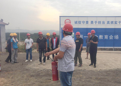 項(xiàng)目部即將進(jìn)行墊層混凝土澆筑施工,現(xiàn)場有大量的木模板、油漆等易燃品,正值高溫季節(jié),火災(zāi)隱患較大。項(xiàng)目部結(jié)合現(xiàn)場實(shí)際組織了本次消防演練,演練分為消防知識培訓(xùn)和火災(zāi)事故演練兩部分。演練前項(xiàng)目經(jīng)理李宏偉通報(bào)了溫嶺槽罐車爆炸事故造成的嚴(yán)重后果,闡明本次演練的目的和意義。隨后項(xiàng)目部安全員王東春對滅火常識、火災(zāi)逃生方法、滅火器如何使用等進(jìn)行了講解,并演示了手提式干粉滅火器的具體使用方法,參與演練的人員親自體驗(yàn)了滅火器的使用。