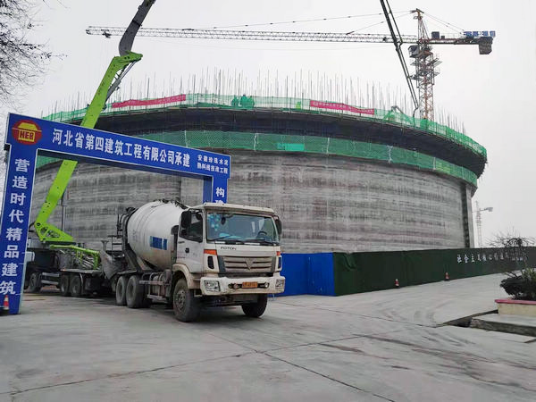 熟料儲(chǔ)存及輸送筒倉(cāng)直徑60米,高20.5米。1月11日,業(yè)主項(xiàng)目負(fù)責(zé)人王利杰組織召開(kāi)專(zhuān)題會(huì)議,鄭重要求1月20日前滑模施工必須完成。面對(duì)業(yè)主早日投產(chǎn)的殷切期盼,項(xiàng)目部緊急組織施工策劃,明確搶進(jìn)度措施辦法,全體動(dòng)員,多點(diǎn)發(fā)力,全力以赴?;J┕?。在動(dòng)員會(huì)上,成立了以項(xiàng)目經(jīng)理為組長(zhǎng)的滑模領(lǐng)導(dǎo)小組,班子帶班,明確責(zé)任目標(biāo);與作業(yè)班組簽訂安全、質(zhì)量承諾書(shū),增強(qiáng)其責(zé)任意識(shí);購(gòu)置鋼筋間距測(cè)量設(shè)備,節(jié)省驗(yàn)收鋼筋工程時(shí)間和人力。由于疫情原因,現(xiàn)場(chǎng)勞力不能迅速到位,項(xiàng)目部提前組織管理人員晚上加班吊運(yùn)鋼筋、水泥、腳手板等材料,大家高漲的干勁兒在滑?,F(xiàn)場(chǎng)起到了積極的帶動(dòng)作用。庫(kù)壁預(yù)應(yīng)力鋼絞線設(shè)置較為密集,每間隔26厘米一道,而且?guī)в腥嵝?,往?kù)壁鋼筋內(nèi)穿設(shè)時(shí)容易跑偏,工作效率低。為加快施工,技術(shù)人員巧妙地在庫(kù)壁鋼筋上加設(shè)了U型鋼筋固定鋼絞線穿行位置,然后大家一字排開(kāi),“一二、一二……”齊聲喊著口號(hào),有節(jié)奏地用力將鋼絞線在庫(kù)壁鋼筋里穿行直到扶壁柱。數(shù)九隆冬的夜間滑模平臺(tái)上氣溫很低,但是大家的工作熱情不減,干勁不退,抬鋼筋、綁鋼筋、穿鋼絞線……,干得熱火朝天,沒(méi)有人叫苦喊累,在大家的共同努力下,滑模以每天2.7米的速度快速推進(jìn)。